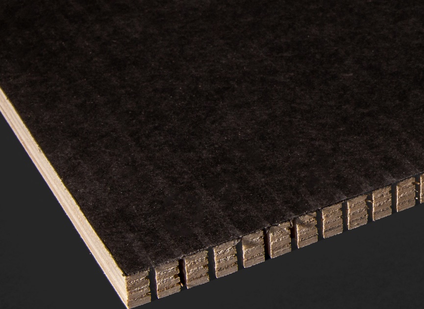 Kerfkore combines a unique base layer manufacturing process with our LTX Black Flexible Backer to create a highly flexible and extremely stable base layer that allows for fast and easy attachment of high-pressure laminates, veneers, metals and many other semirigid materials. When using Kerfkore, the decorative surfacing material can be applied while flat and then formed into the desired shape achieving a 3 1/2″ radius.